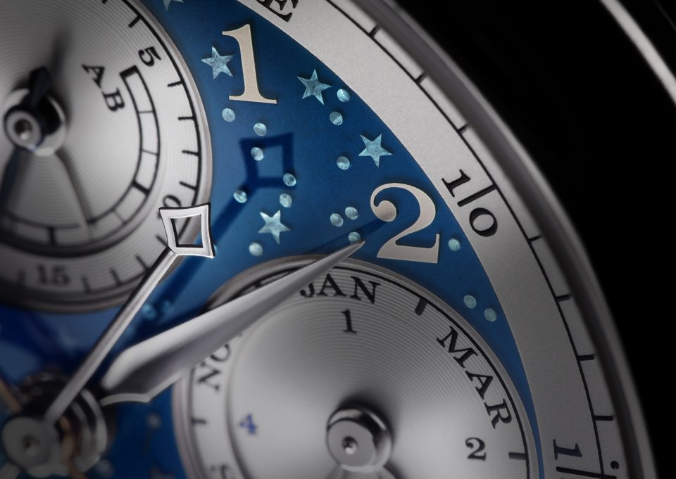 A.ランゲ&ゾーネがダイヤルにエナメル焼成とエングレービングを組み合わせた装飾を試みたのは、このモデルが初めてです。無垢のホワイトゴールドに浮彫り技法で星を描き、深い青色の釉薬を焼き付けることによってムーンフェイズ表示に立体感を出し、一層魅力的な表情を与えています。エナメル表面と同一面に整列させた算用数字は、時刻表示、カレンダー表示およびパワーリザーブ表示のロディウム仕上げのゴールド製針と見事に調和しています。