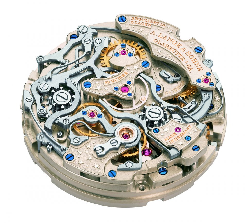 複数の複雑機構を同時に搭載するという技術面での意気込みは、芸術的なムーブメントの装飾にも表れています。洋銀製の輪列受けの表面に見られるきめ細かな粒状感は、往年の懐中時計のムーブメントの仕上げ装飾に倣ったものです。ラトラパント受けとテンプ受け、クロノグラフ受けと切替えレバー受け、そしてカバープレートに見られるトランブラージュ・エングレービングに、ダイヤルに描かれた星々が自然に溶け込んでいます。631個の部品からなる自社製キャリバーL101.1がランゲ最高品質基準に準拠して仕上げられていることは、言うまでもありません。