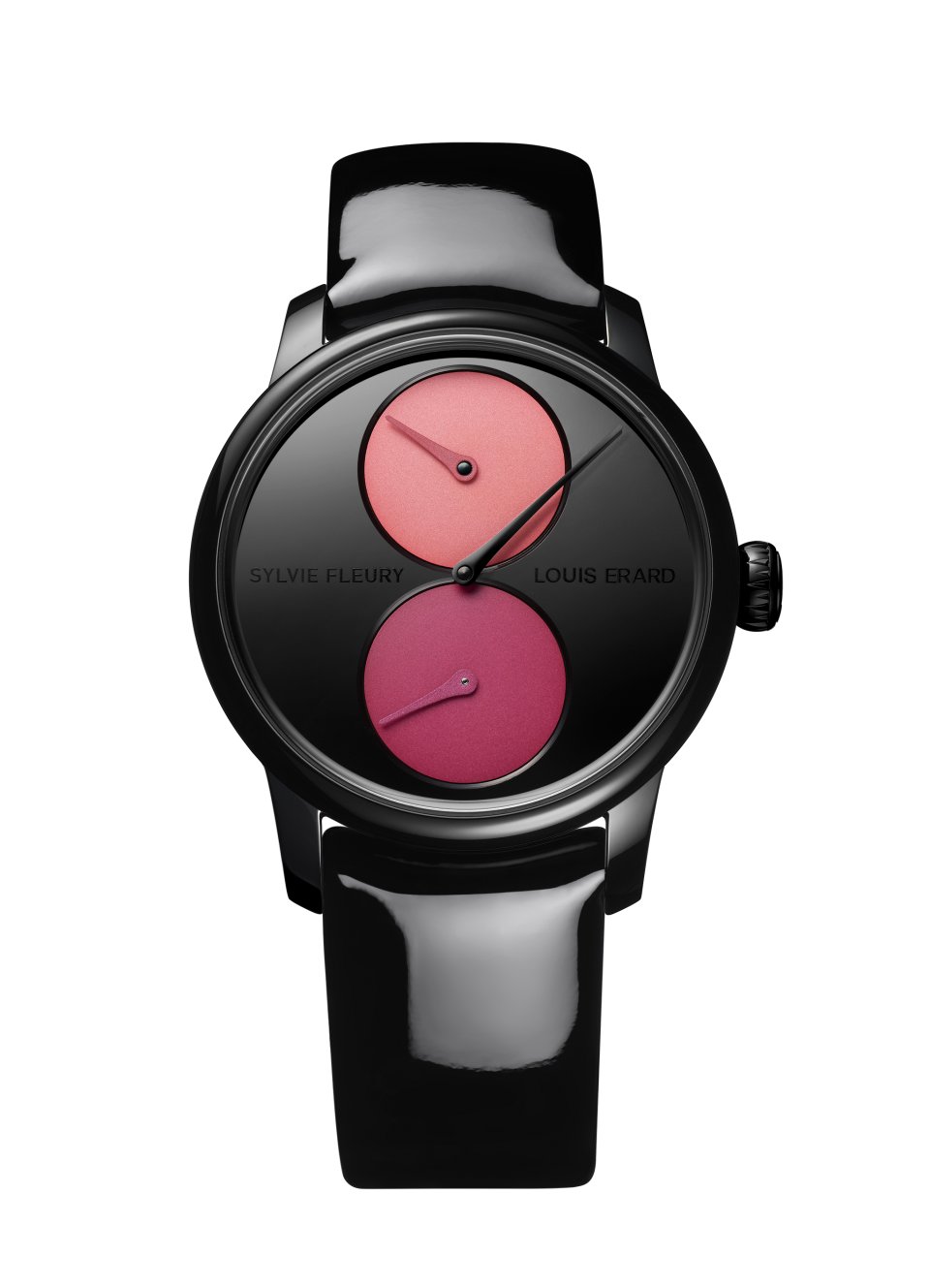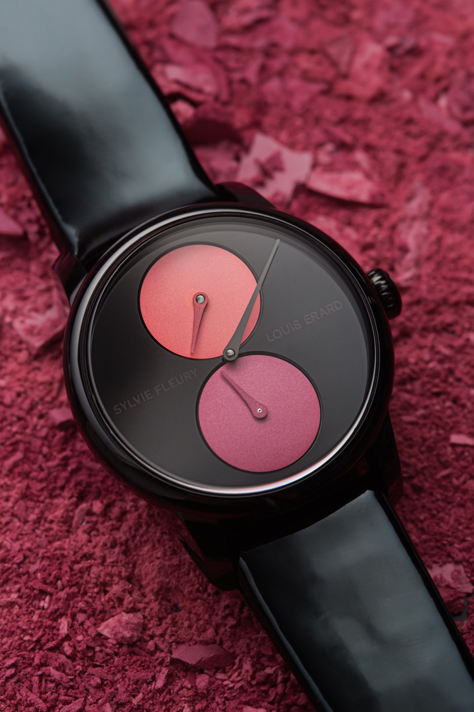 ・ハンズ: マットコーラル色の時針、マットマジェンダ色の秒針、ポリッシュブラックPVD の分針