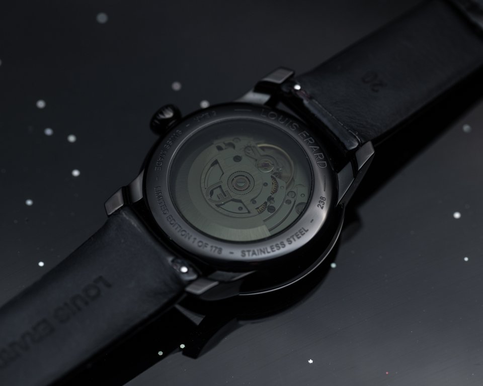 ・精微な装飾のオープンワークローターにブラックラッカー仕上げのルイ エラールのブランドシンボルロゴ