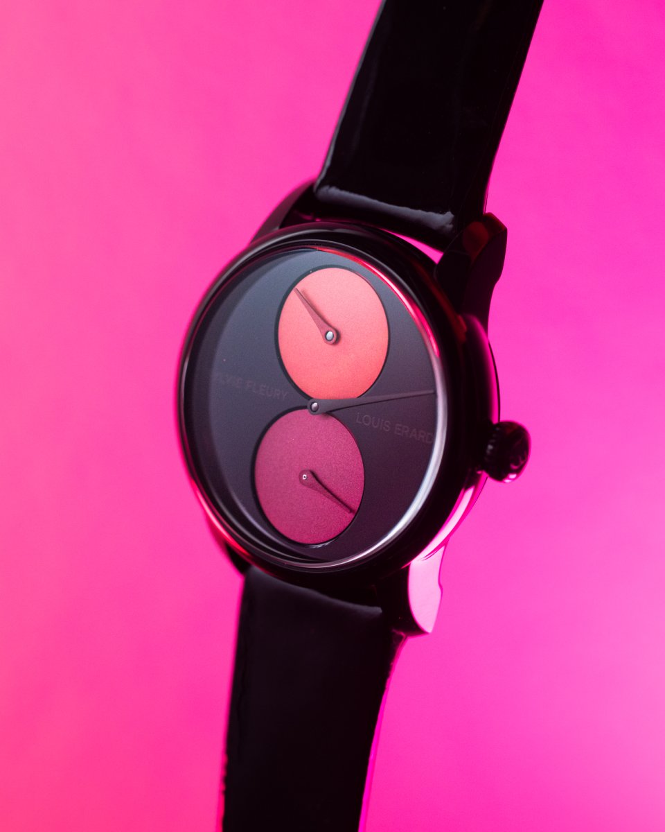 「レギュレーター ルイ・エラール X シルヴィ・フルーリー」は39mm サイズで、ポリッシュ仕上げにブラックPVD 仕上げのスチールケースに、メイクアップパレットにインスパイアされたブラックラッカーダイアル、ドーム状のコーラル色の時針サブダイアル、マジェンダ色の秒表示ダイアルを組み合わせています。日本円価格は957,000 円(税込)です。全国の厳選された時計専門店にて、2025 年2 月中旬より発売されます。