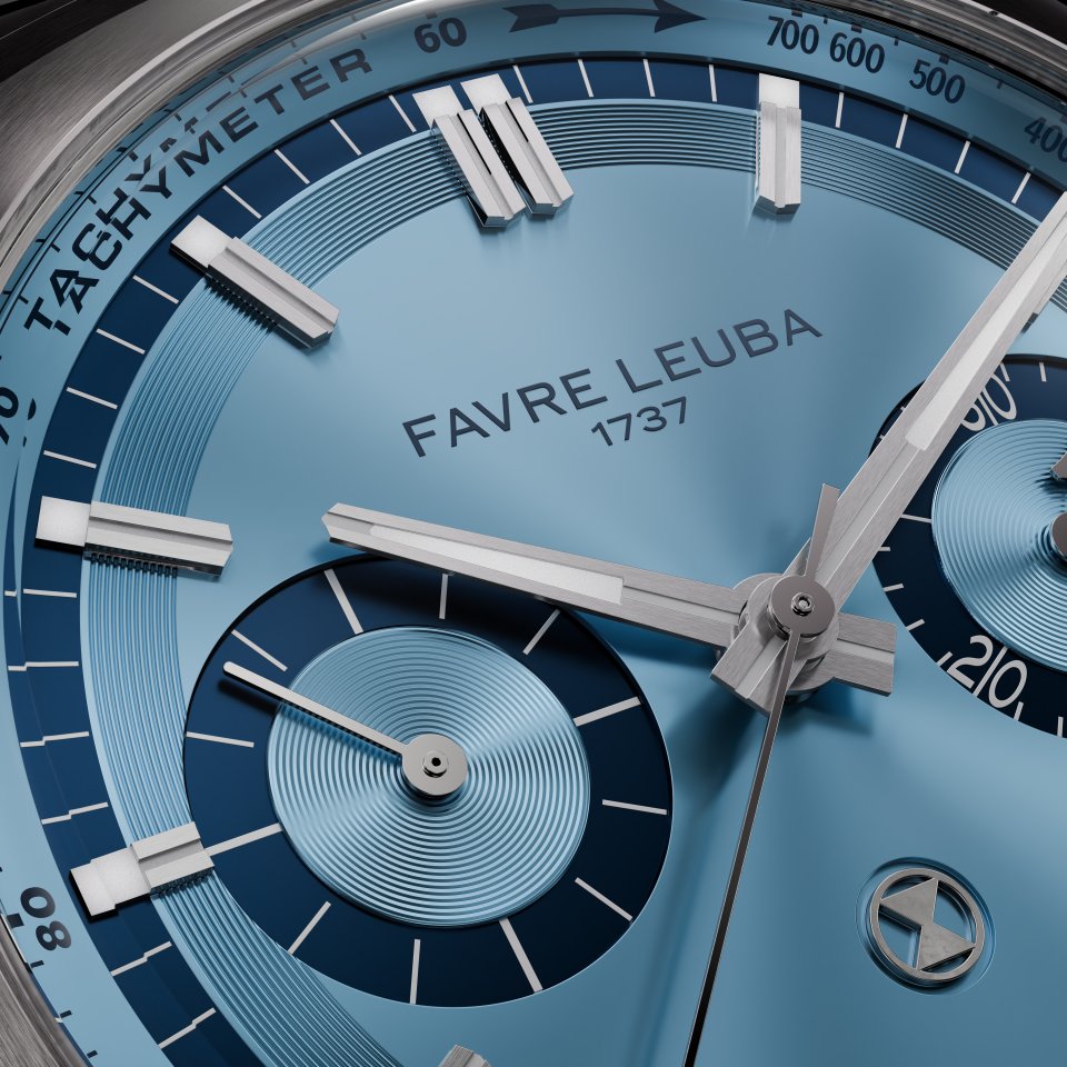 文字盤はブラック、ブルー、アイスブルーの3色展開です。100を超える最新の注意を払った最高水準の製造工程を要して製作されました。奥行き感の構造が印象的なコントラストを生み出し、2つの隆起したサブダイヤルがそれをさらに引き立て、卓越したレベルの仕上がりが表現されています。9時と3時の位置にビ・コンパックスカウンターを配置し、分と秒を正確に読み取れるチーフ・クロノグラフは、ファーブル・ルーバの革新とクオリティへのこだわりを完璧に体現しています。スポーツ・クロノグラフに必須の、速度を測るためのタキメーター・スケールを内側のフランジに備えたこの文字盤は、洗練されたディテールでさらに際立っています。ファーブル・ルーバのエンブレムである3Dの様式化された砂時計が6時位置に配置され、洗練された雰囲気を醸し出しています。