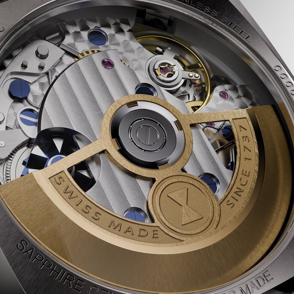 サファイア・クリスタル製のケースバックから見えるムーブメントは、サーキュラー・グレイン、コート・ド・ジュネーブストライプ、サンバースト・パターンなどの完璧な仕上げで贅沢に装飾されています。4Nゴールド・プレイトのローターには、ファーブル・ルーバの砂時計のエンブレムと「Swiss made since 1737」がエングレーブされ、特別な起源にさらなるエレガントなタッチを加えています。