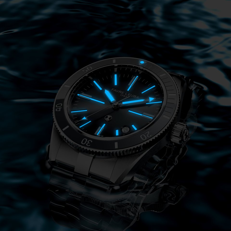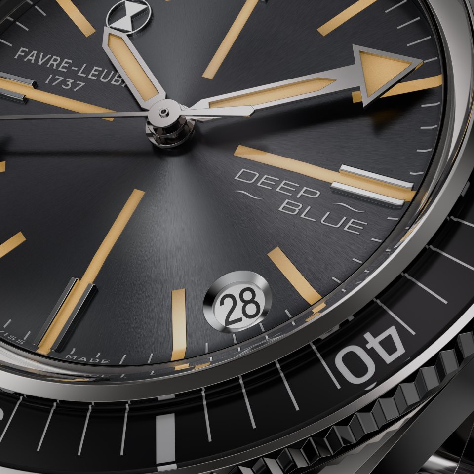 径39mm、厚さ12.75mmのケースは、60年代モデルの200mを超える水深300mまでの防水性を実現するように設計、製造されています。無停止潜水時間の計算と監視のために逆回転防止ベゼルなど、プロ仕様のダイバーズ・ウォッチ求められるすべての要件を満たしています。このエレガントでスリムかつ堅牢なケースにより、ディープブルーリバイバルはダイバーにとって理想的な相棒となり、海面下でも海上でも、濡れていても乾いていても、手首に抜群の快適さを提供します。「Favre Leuba 1737」と砂時計のエンブレムが刻印された頑丈なケースバックは、歴史的な前モデルとまったく同じです。