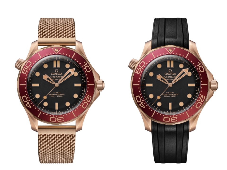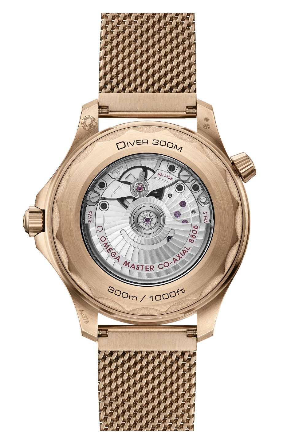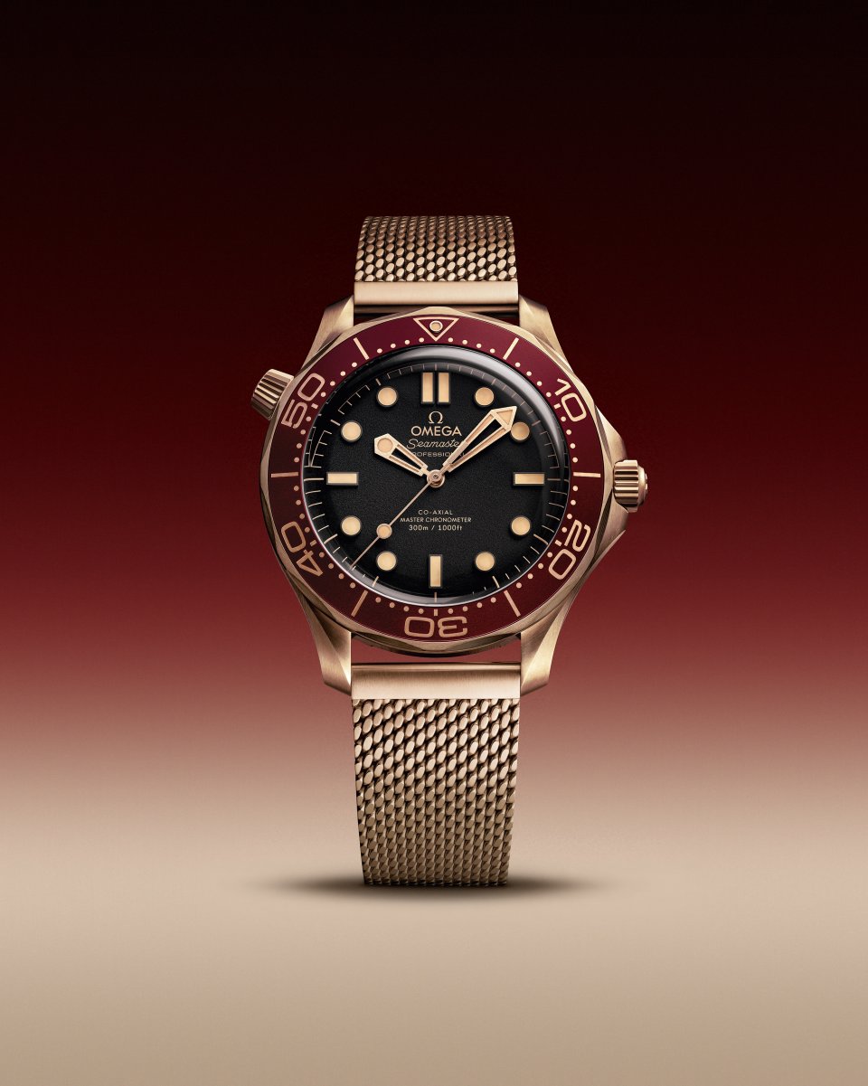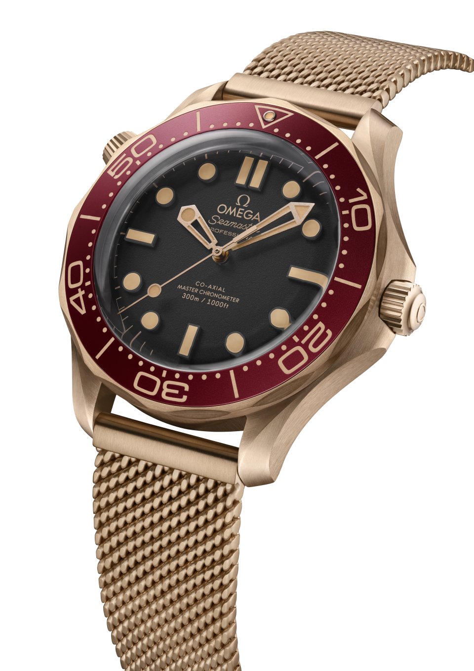 この特別なブロンズゴールドモデルは、最近のシーマスター ダイバー300Mと同様、2020年公開のボンド映画『007/ノー・タイム・トゥ・ダイ』のために発表した「シーマスター ダイバー300M 007 エディション」にインスパイアされています。共通の特徴は、メッシュブレスレット、シュウ酸アルマイト加工のアルミニウム製ベゼルリングとダイアル、ドーム型サファイアクリスタルなどです。