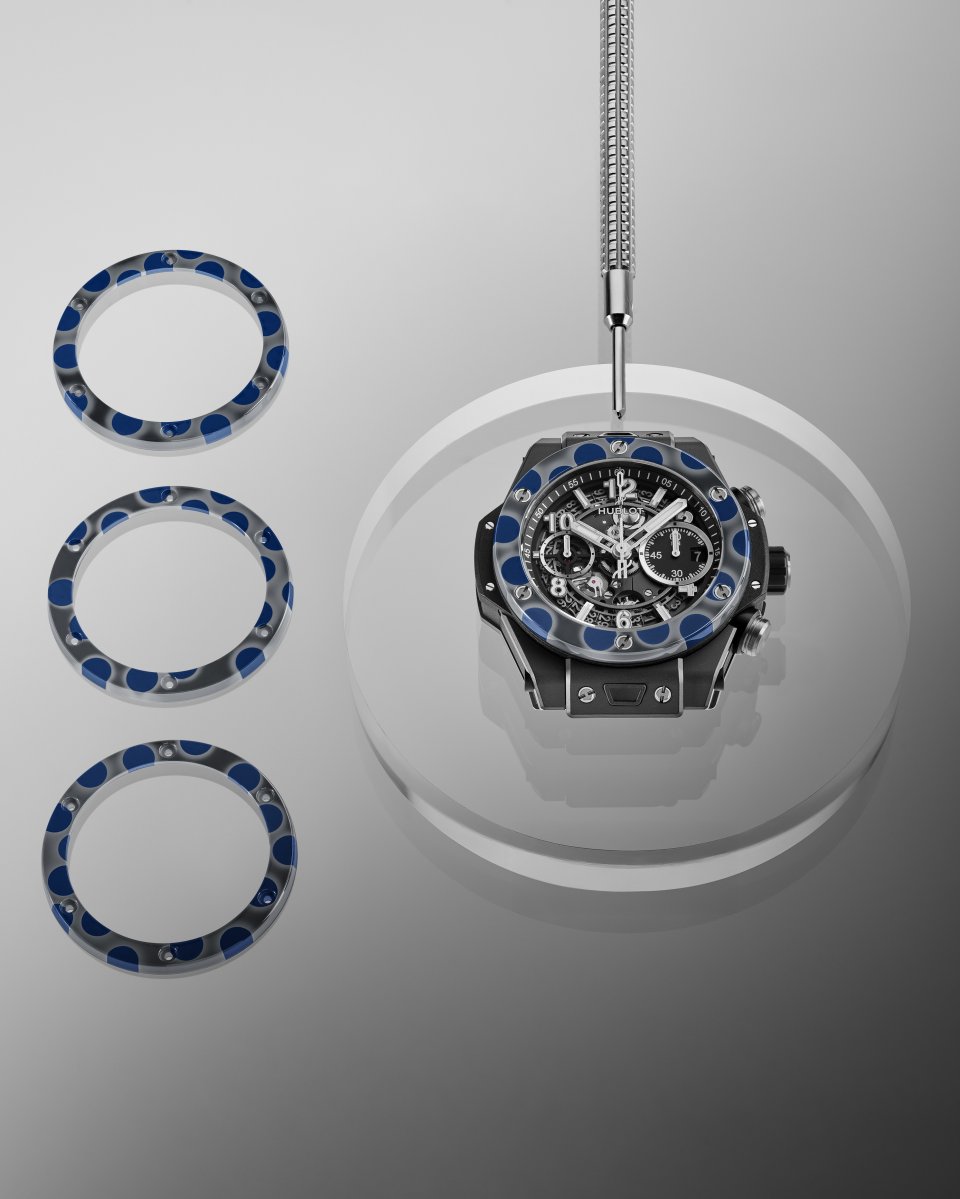 面白く、魅惑的で、理屈や道理を超えた、他では見たことがないようなカラーセラミック。「ビッグ・バン ウニコ マジックセラミック」では、ダークグレーのセラミックで作られたベゼルに、一見ランダムで有機的なパターンで配置された強烈なブルーのサークルが配されています。コンテンポラリーな抽象画やポップアートのように、サークルがセラミックの他の部分と完璧かつシームレスに一体化している様子は、特許出願中のプロセスの独創性を証明しています。