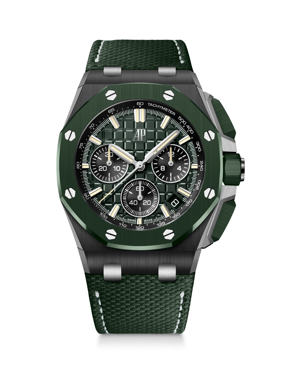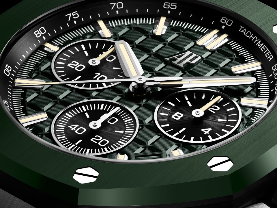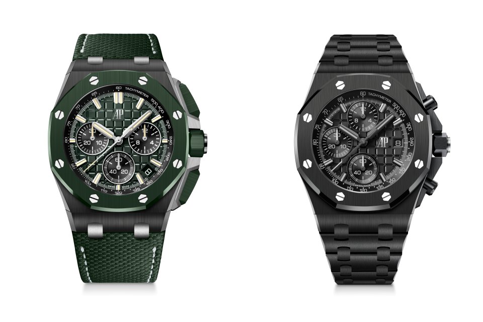 1つ目のモデルは、43 mmのブラックセラミックケースにグリーンセラミックのベゼル、リューズ、プッシュボタンを組み合わせたスポーティなスリートーンのデザインを特徴とし、チタン製のディテールとのコントラストを生み出しています。2 つ目のモデルは、スリムでモノクロなブラックのデザインを特徴とし、42 mmのケースと一体型ブレスレットすべてがブラックセラミックで作られています。両モデルには、オーデマ ピゲ最新の一体型自動巻きクロノグラフムーブメント、キャリバー 4401 とキャリバー 4404 を搭載しており、チタンとサファイアガラスのケースバックからその美しい装飾を鑑賞することができます。新作の先進的なデザインは、工業用セラミックの堅牢さと丁寧な手作業による仕上げを融合させ、職人たちが何世代にもわたり受け継いできた細部へのこだわりを際立たせています。
