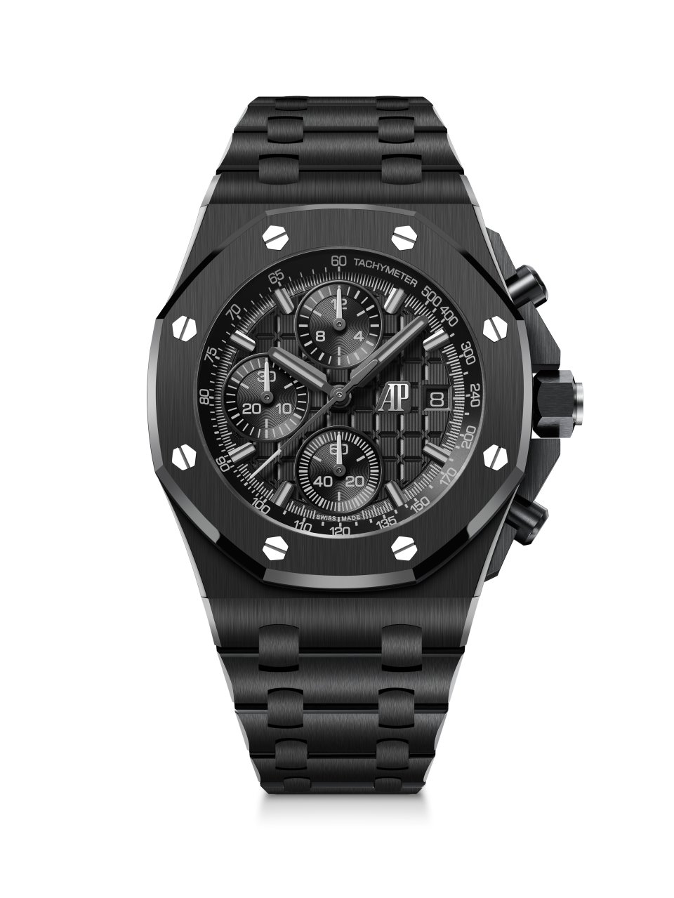 2つ目のモデルは、直径42 mm のブラックセラミックケースと、それにマッチした一体型ブレスレットを組み合わせた力強いモノクロームデザインで、スティール製の6 角形のビス8 本とAP のモノグラムだけがコントラストを生み出しています。文字盤には最新世代のメガータペストリーパターンが、インナーベゼル、6 時、9 時、12 時位置のカウンターにはブラックガルバニック加工が施され、タイムピース全体に統一感のある色調を実現しています。この落ち着いた美しい外観をさらに際立たせるのが、ダークグレーのタキメータースケールとクロノグラフ表示で、ブラック加工の18K ホワイトゴールドの針とバトン型アワーマーカーにはグレーの蓄光処理が施されています。