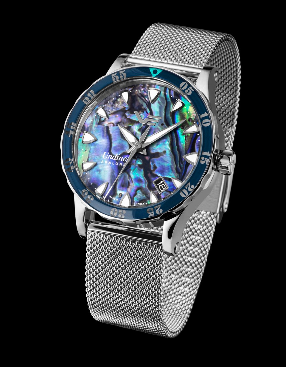 39mmのステンレススチールケースに収められた「UNDINE」は、回転式ダイバーズベゼルと200m防水性能を備え、水辺でのあらゆるアクティビティに適応。