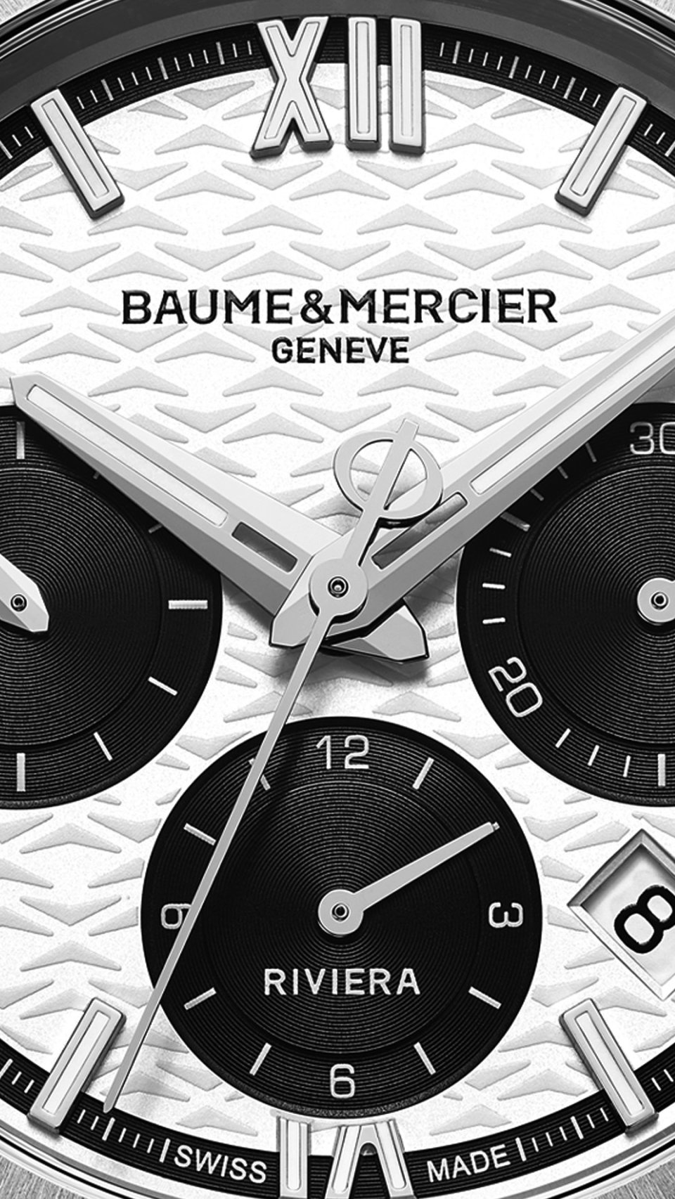 1950年代風のこのリビエラは大胆なハーモニーの黒白のコントラストをアピール。シックで落ち着いたスタイルはボーム&メルシエの自由な創造性をよく表現しています。波のモチーフで飾られたホワイトダイヤルはブラックの見切りで囲まれ、紺碧がかった黒のカウンターと呼応します。それに対してリベット留めのローマ数字とインデックス、ファセットをつけた時・分針はロジウム加工で、白のスーパールミノバ(ブルー発光)加工を施し、バイカラー効果を高めています。