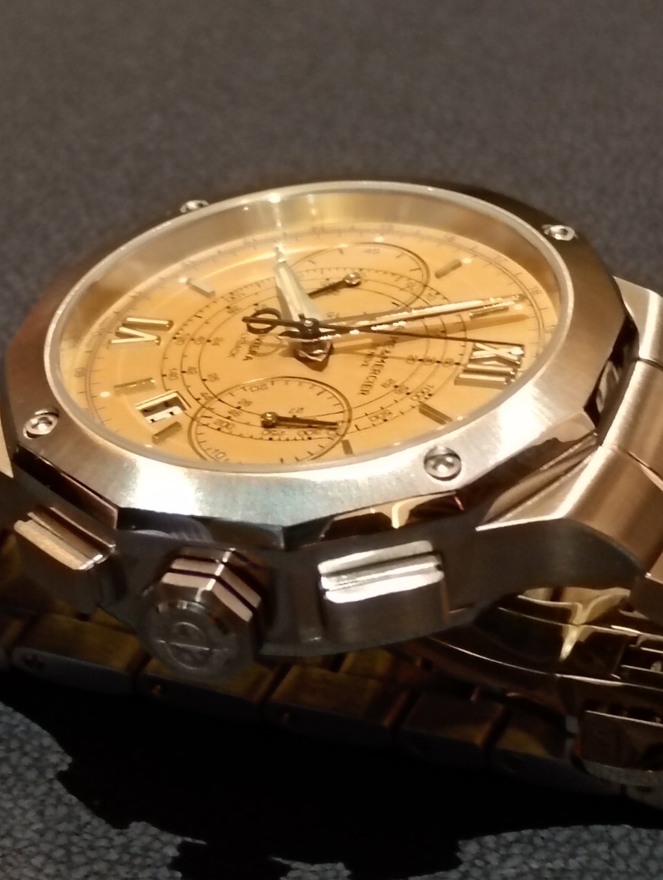 この明るい光に照らし出されるのは12の面を持つポリッシュ/サテン仕上げのステンレススティールケース。両面反射防止加工を施した傷つきにくいサファイアガラスが上面とケースバックの両方をカバーします。ベゼルはポリッシュとサンサテン仕上げのステンレススティールで4個のネジで固定、同様にサファイアガラスでカバーした12角形のケースバックも4個のネジ固定です。