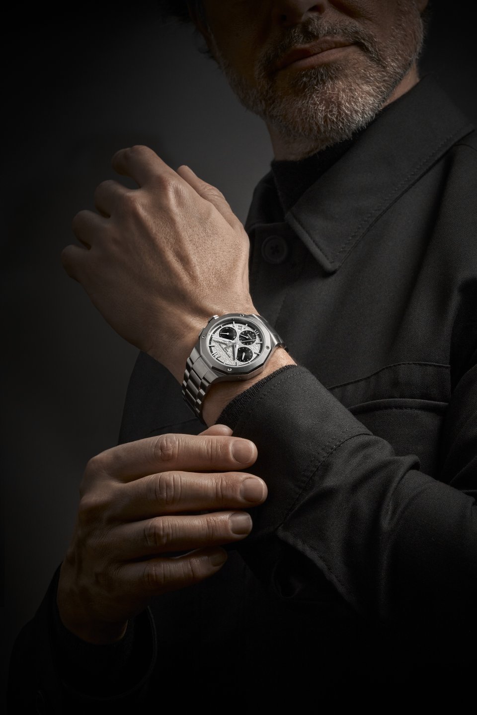 現在の43ミリバージョンを思わせるこのモデルは今回、径41ミリ、厚さ13.94ミリのサイズでコレクションに加わりました。より細い手首向けのサイズで、12角形ケースはポリッシュ/サテン仕上げのステンレススティール、両面反射防止加工を施した傷つきにくいサファイアガラスでカバーしています。同様に12の面を持つ12角形のベゼルはポリッシュとサテン仕上げのステンレススティール、サファイアガラスをはめたケースバックも共に4個のネジで固定されています。ケースバックには、ご希望のエングレービングを施すこともできます。8角形のリューズはステンレススティールで、メゾンのロゴのPhiを優れたバランスと品質のシンボルとしてエンボス加工で表現しています。