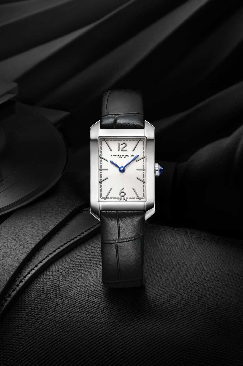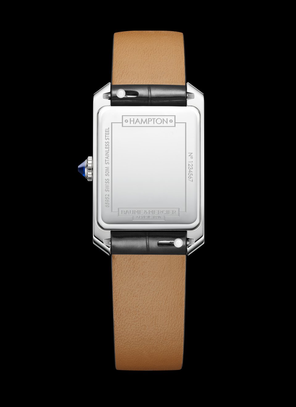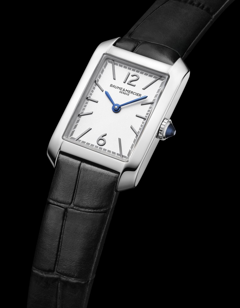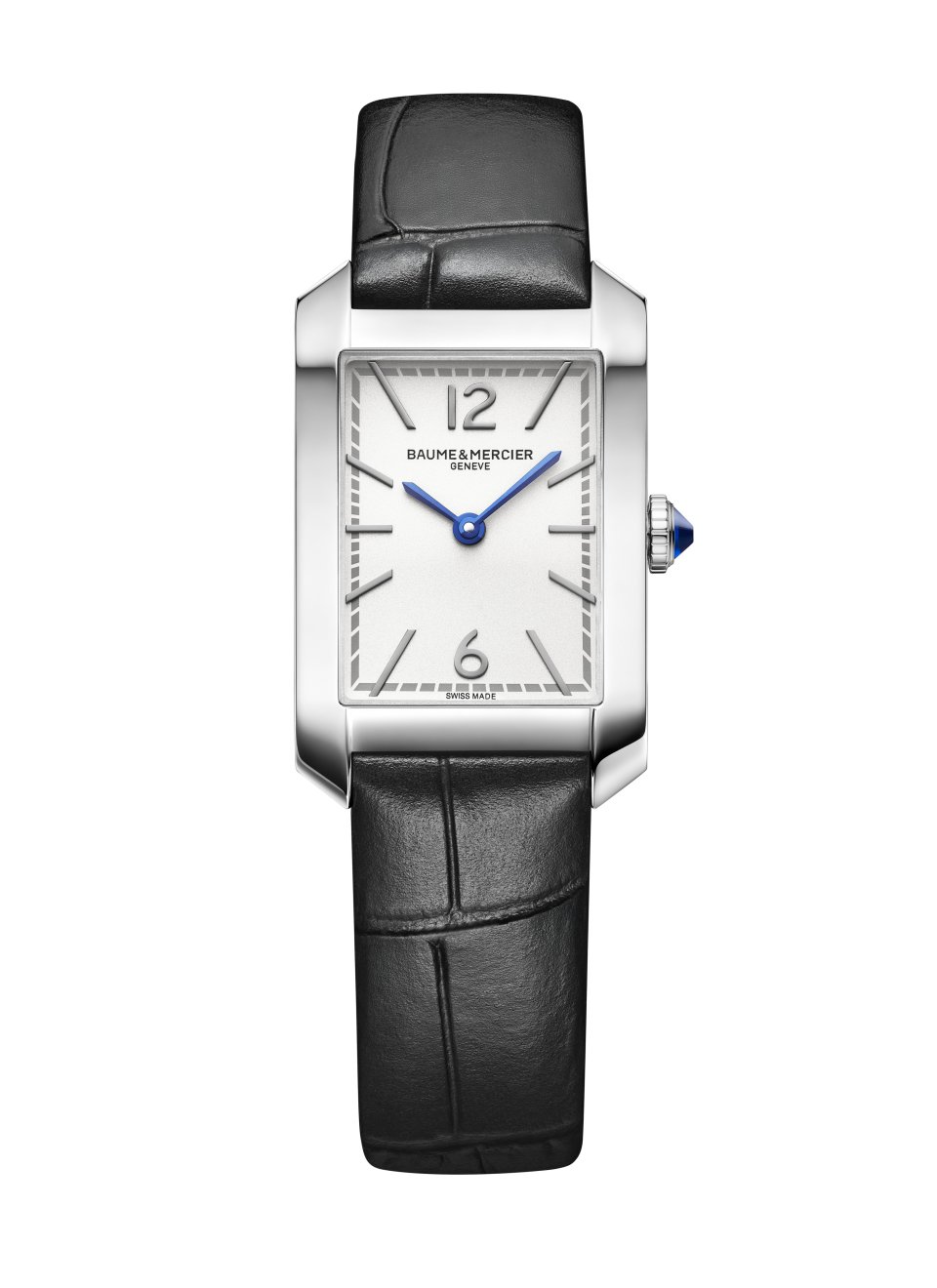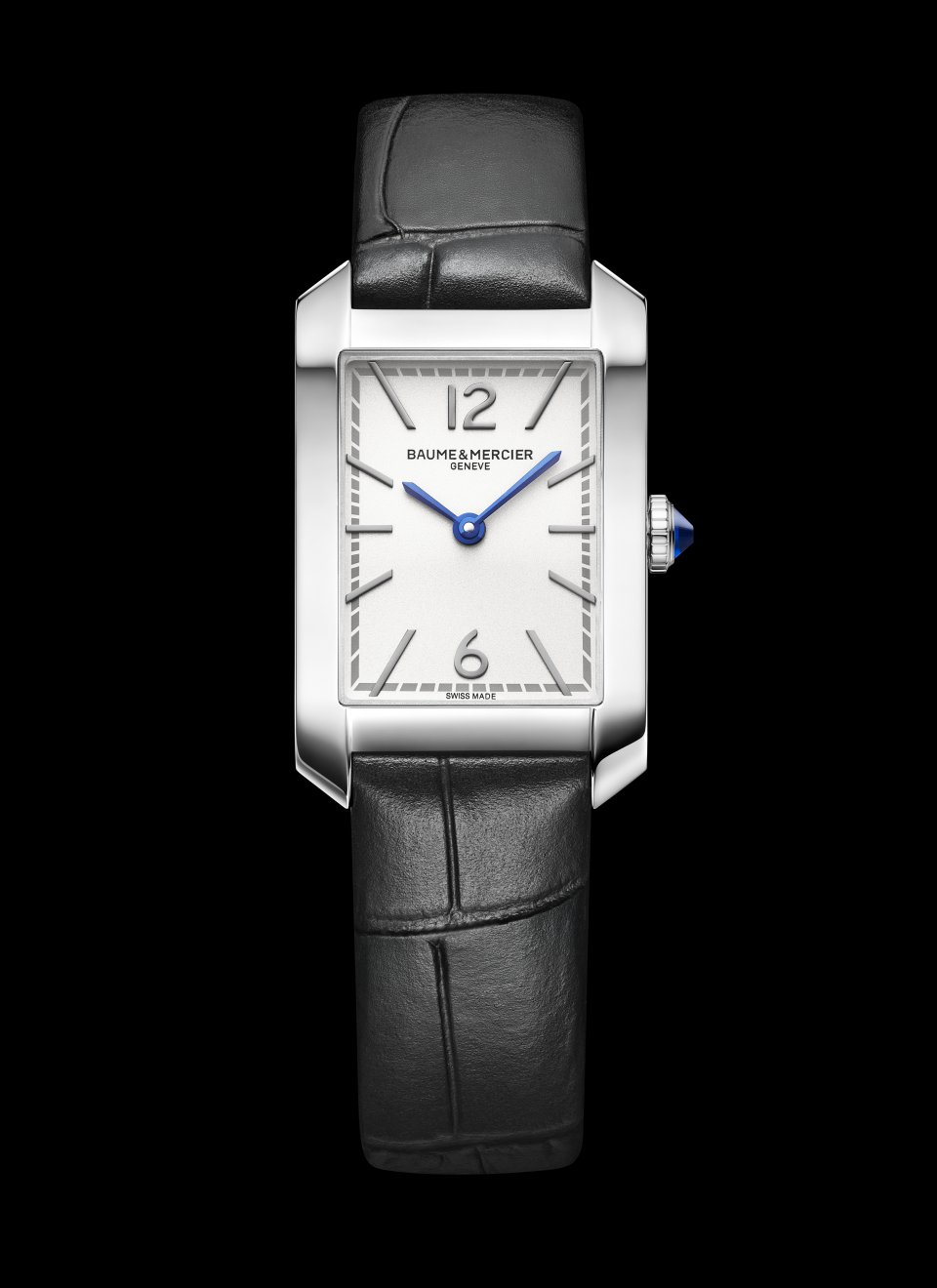 ポリッシュ仕上げのステンレススティール ケースは、35 x 22,2 mm、厚み6,92 mmの計算されたプロポーション。その長方形のダイヤルスペースで時針と分針が回ります。さらに傷のつきにくいドーム型サファイアクリスタルがダイヤルを保護します。フルケースバックにはエングレービングを施すことができます。スティールのエレガントなカボションリューズには、ブルーの針と美しく呼応するブルーのスピネルストーンがはめこまれています。このストーンは知恵、保護、信頼、尊敬と誠実さを象徴するとされています。
