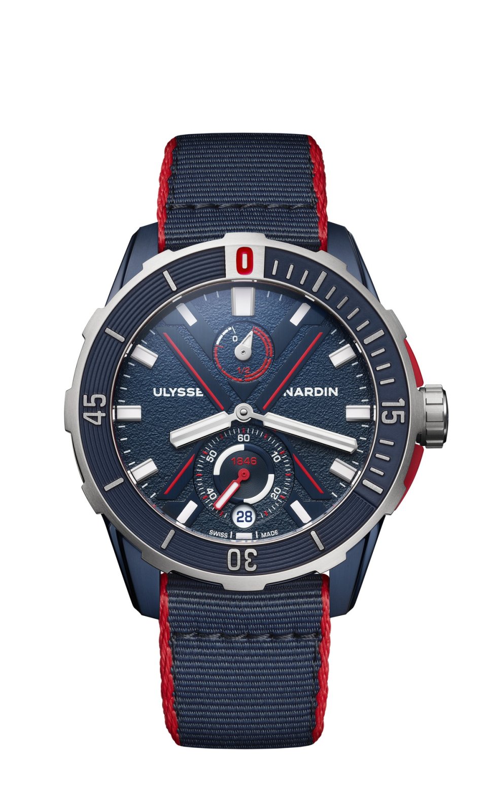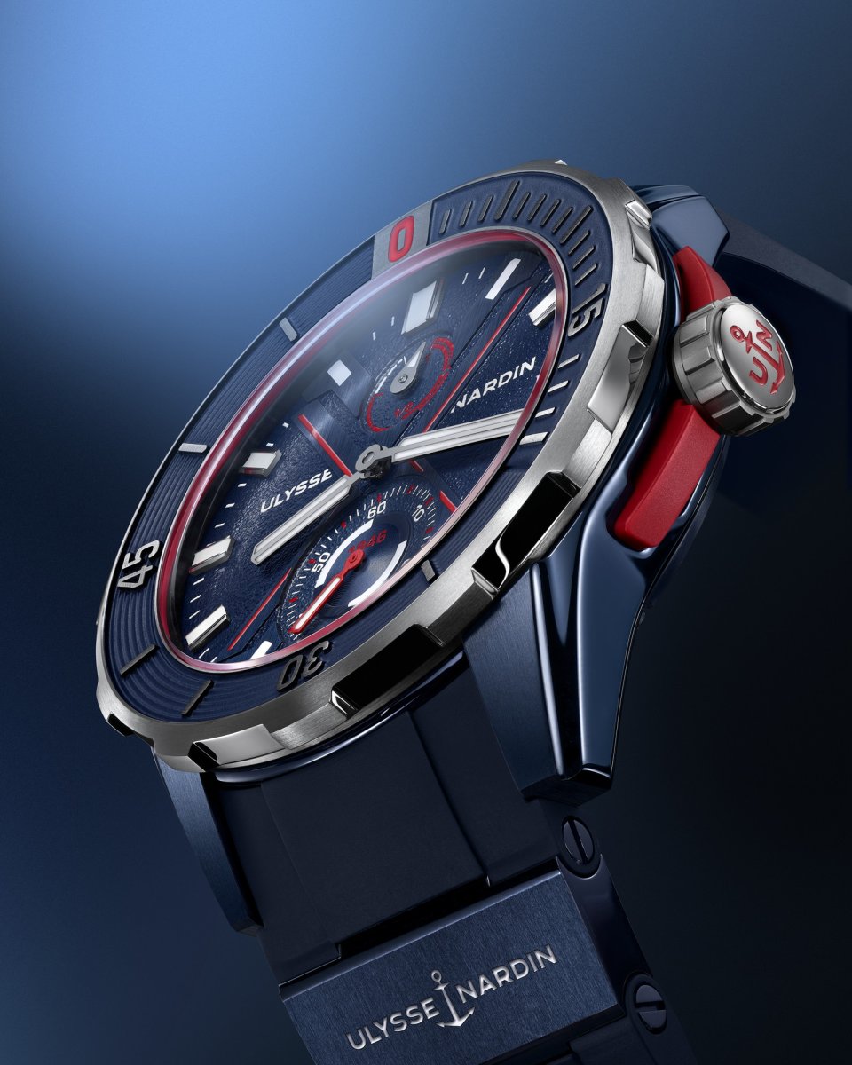 ブルーのサンドブラスト加工を施した文字盤には、赤と青の「X」のアクセントがあしらわれ、ユリス・ナルダンのコレクションに繰り返し登場するモチーフと呼応します。このモチーフは、時計製造のデザインとテクノロジーに対するメゾンのアプローチの爆発的な創造性を象徴しています。6時位置には、夜光塗料を塗布した秒針を備えたスモールセコンドが配されています。これは暗い場所でも時計が作動状態にあり、正確な時刻を示すことが求められるダイバーズウォッチには不可欠な要素です。