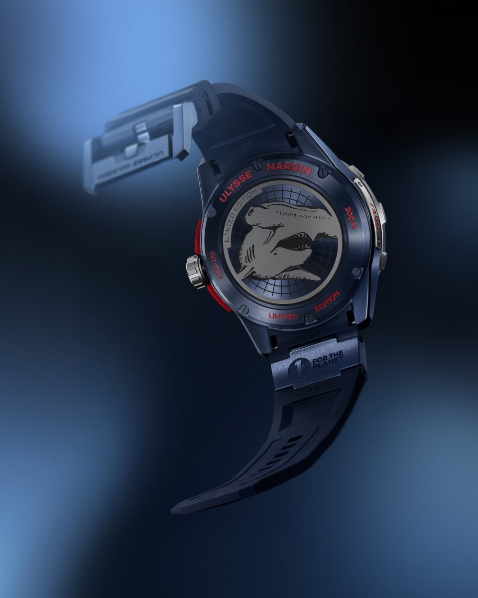 ブルーのPVDコーティングを施したチタン製ケースバックには、ハンマーヘッドシャークのモチーフと、モデル番号、リミテッドエディション、300メートルの防水性能を示す赤いディテールのエングレービングが施されています。ラバーストラップに備わっているチタン製シングルリンクの裏側には「1% for the Planet」のロゴが刻印されています。