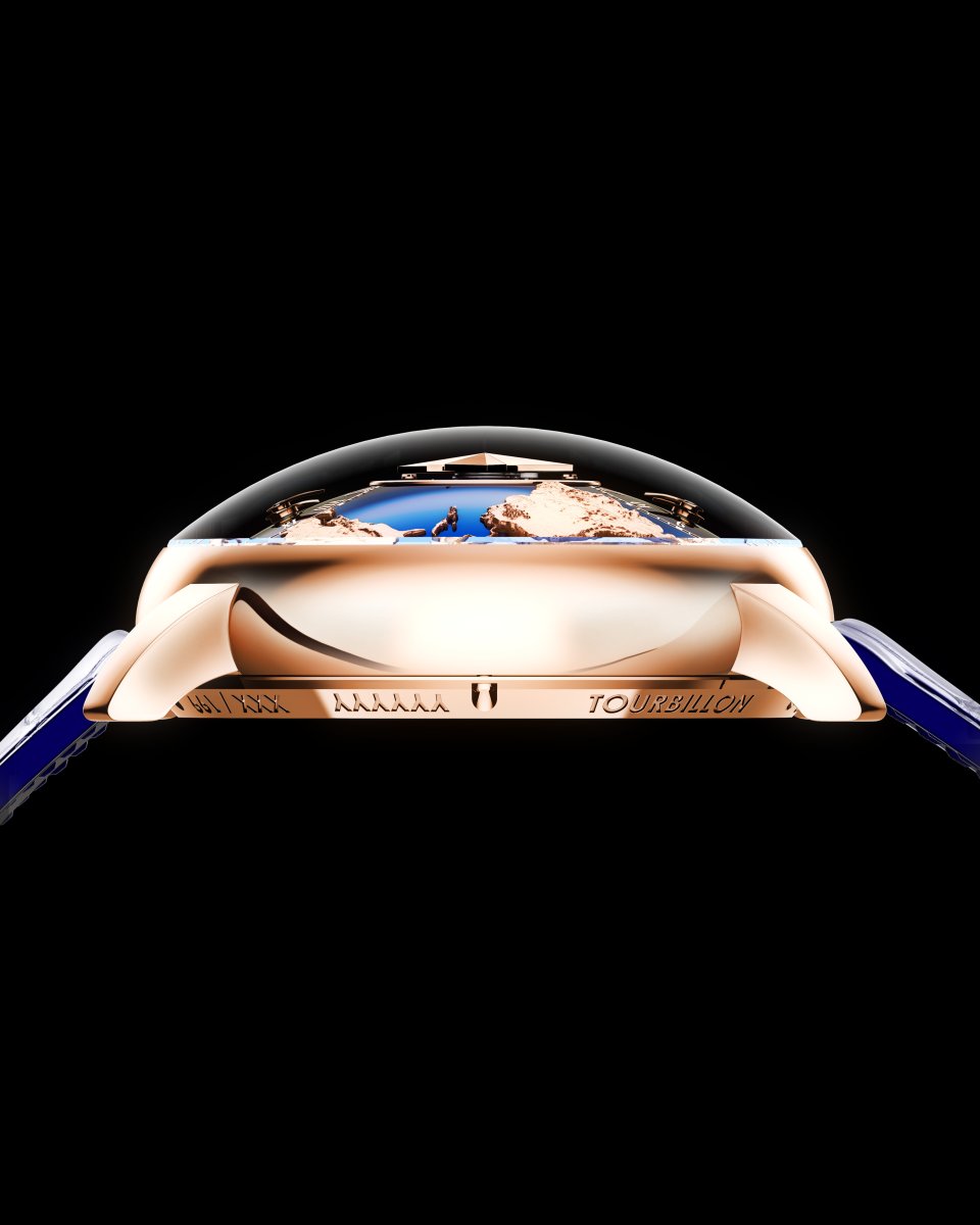 2023年モデルでもアーチを描く立体的な文字盤が印象的でしたが、今作ではその造形美がさらに進化しています。地球を想起させる球体的なフォルムがより強調され、まるで手のひらに地球儀を載せているかのような感覚を与えてくれます。