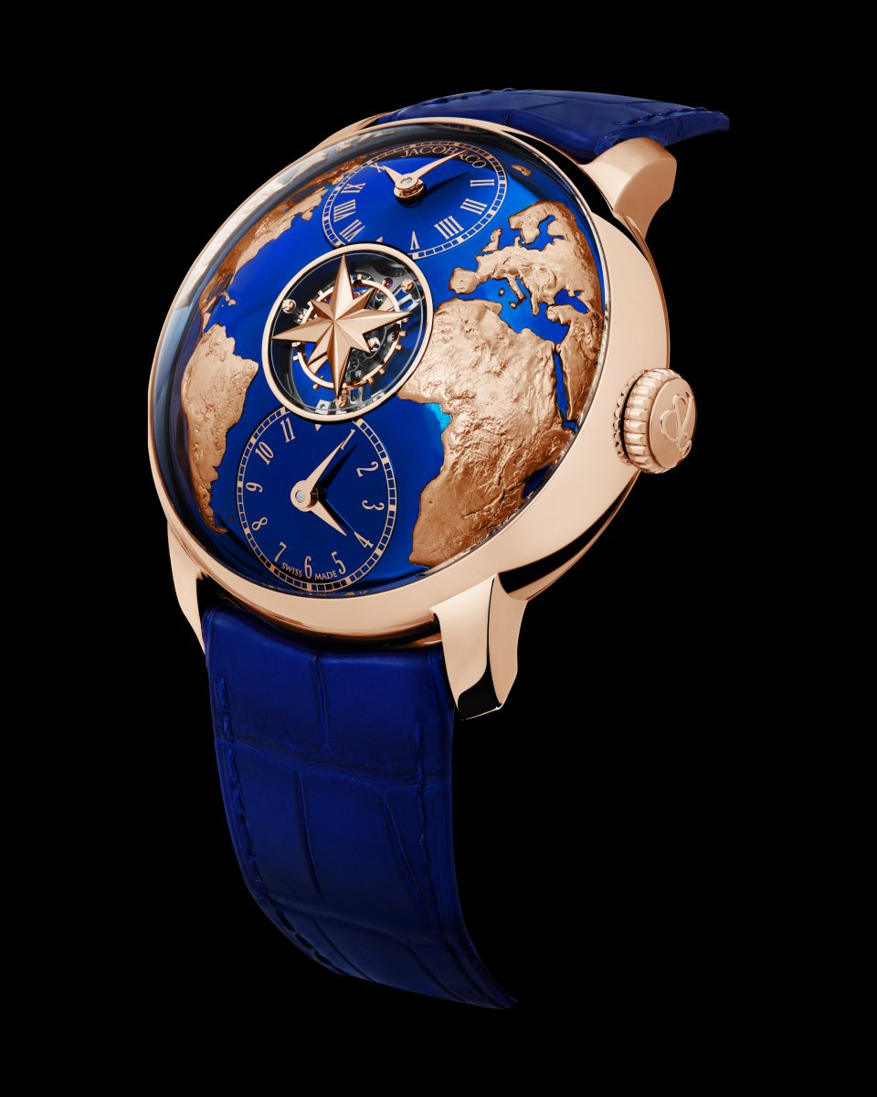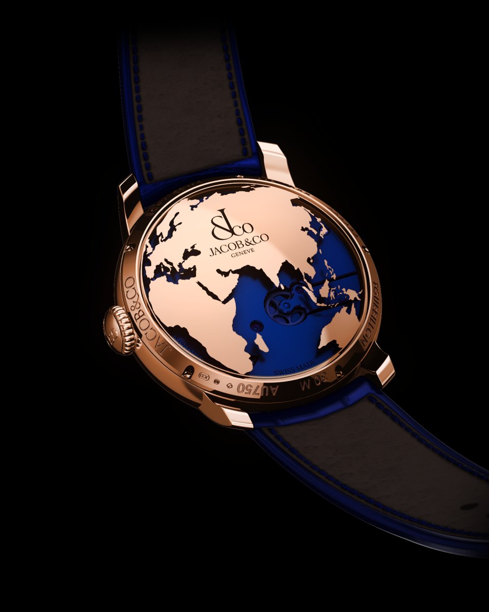 ケース全体で“地球”を表現するという一貫したデザイン哲学は健在であり、文字盤にはローズゴールド仕上げの繊細な刻印が施され、ケースバックにはメタライゼーション加工によって大陸が描かれています。