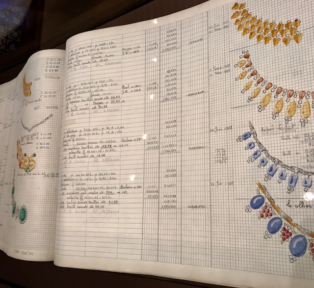1940年~ 当時は、宝飾品が制作される都度、この様なデザイン台帳に材料ひとつひとつの仕入先、原価などが事細かに記録されていたのです。