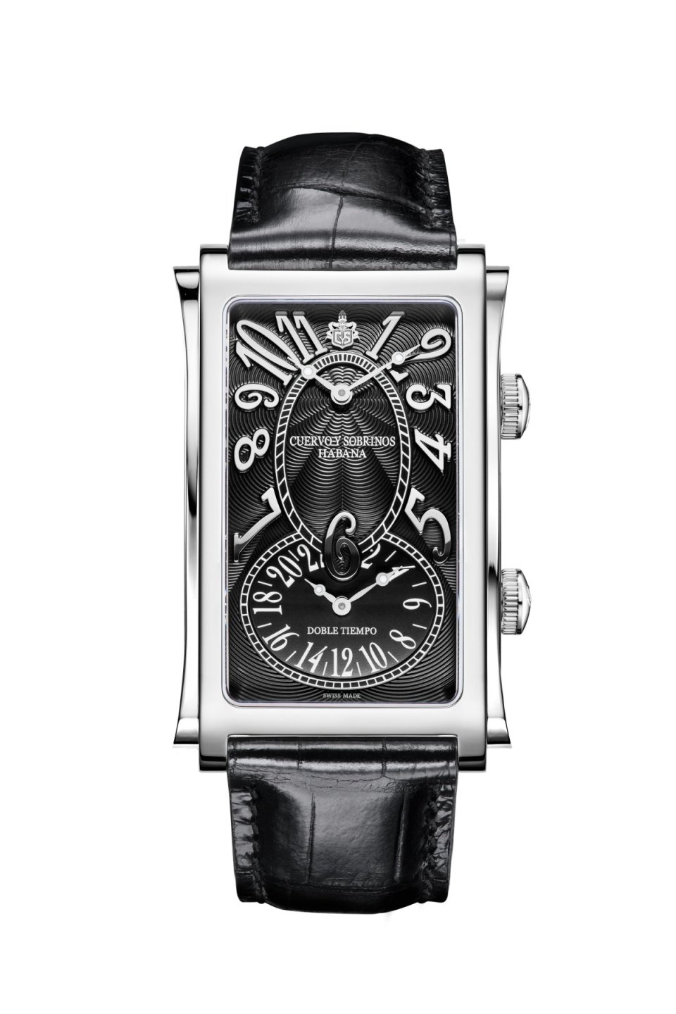 キューバの首都ハバナにルーツをもつクエルボ・イ・ソブリノスの時計は、キューバの雰囲気を感じる色使いやデザインが特徴的。大ぶりのレクタンギュラーケースが目を引く「プロミネンテ ダブルテンポ」は、1つのダイヤルに12時間計と24時間計の2つの時刻表示を搭載しています。それぞれを異なるムーブメントで制御する、個性的な一本です。
