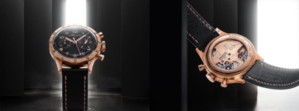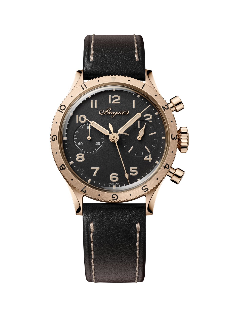 1955年に発表されたブレゲの民間用クロノグラフを現代に再解釈した「タイプXX クロノグラフ 2075」は、ブレゲ独自のブレゲゴールドケースと、航空機素材ジュラルミンを用いたブラックダイアルが特徴。往年のパイロットウォッチの精神を受け継ぎながら、最新の技術で昇華させています。
