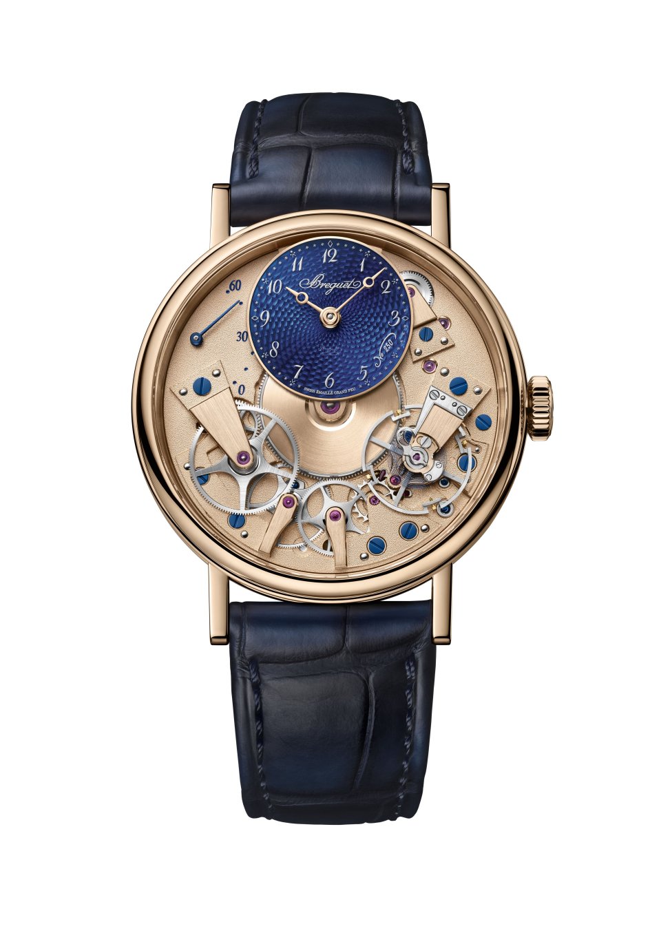 「トラディション・レトログラード・セコンド 7035」は、ブレゲ創業250周年という節目に誕生した、極めて象徴的な機械式腕時計です。新素材の独自合金「ブレゲゴールド」をまとったケース、透明感あふれるブルーのグラン・フー エナメルと、精緻なギヨシェ模様が織りなすダイヤルは、セーヌ川の空撮図や18世紀パリの地図からインスピレーションを得たもの。