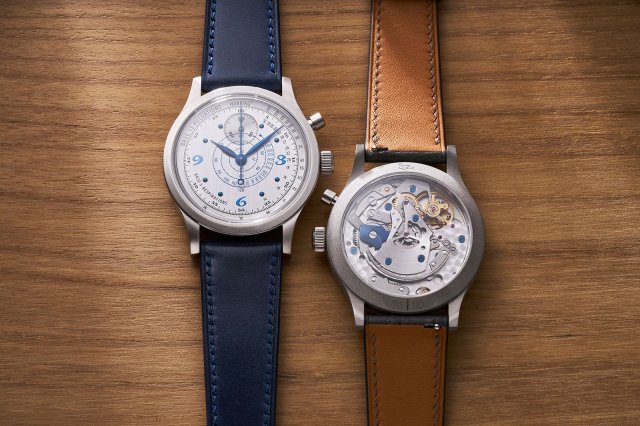 製作: スティール製クロノグラフ部品は、独立時計師ペールマン・ブレザン(Pöhlmann-Bresan)の手作業による仕上げ