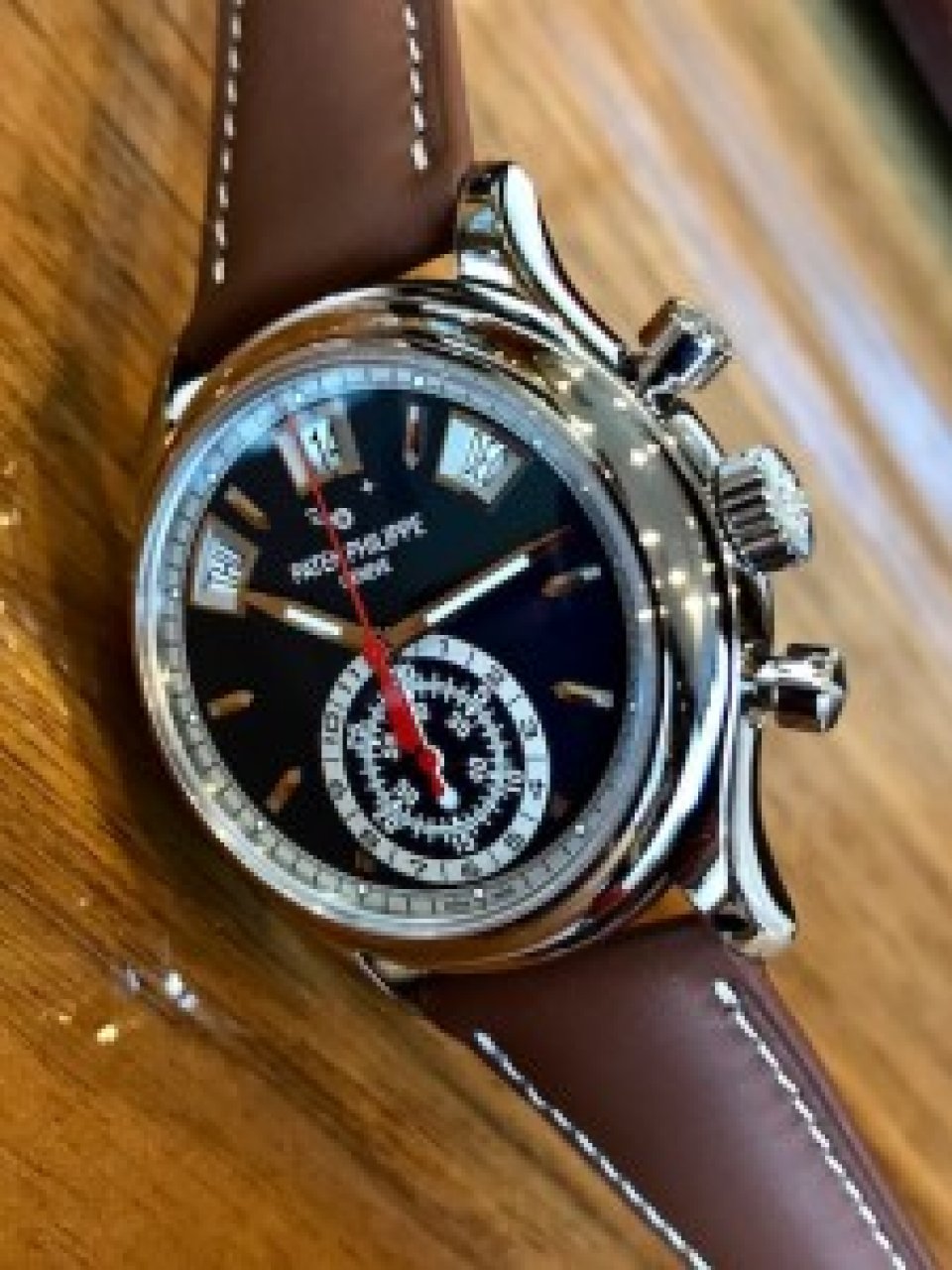 ベージュのステッチが入ったブラウンのカーフストラップが、さらにスポーティ感を強調しています。