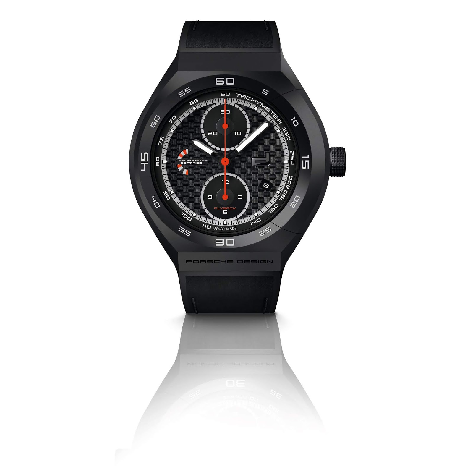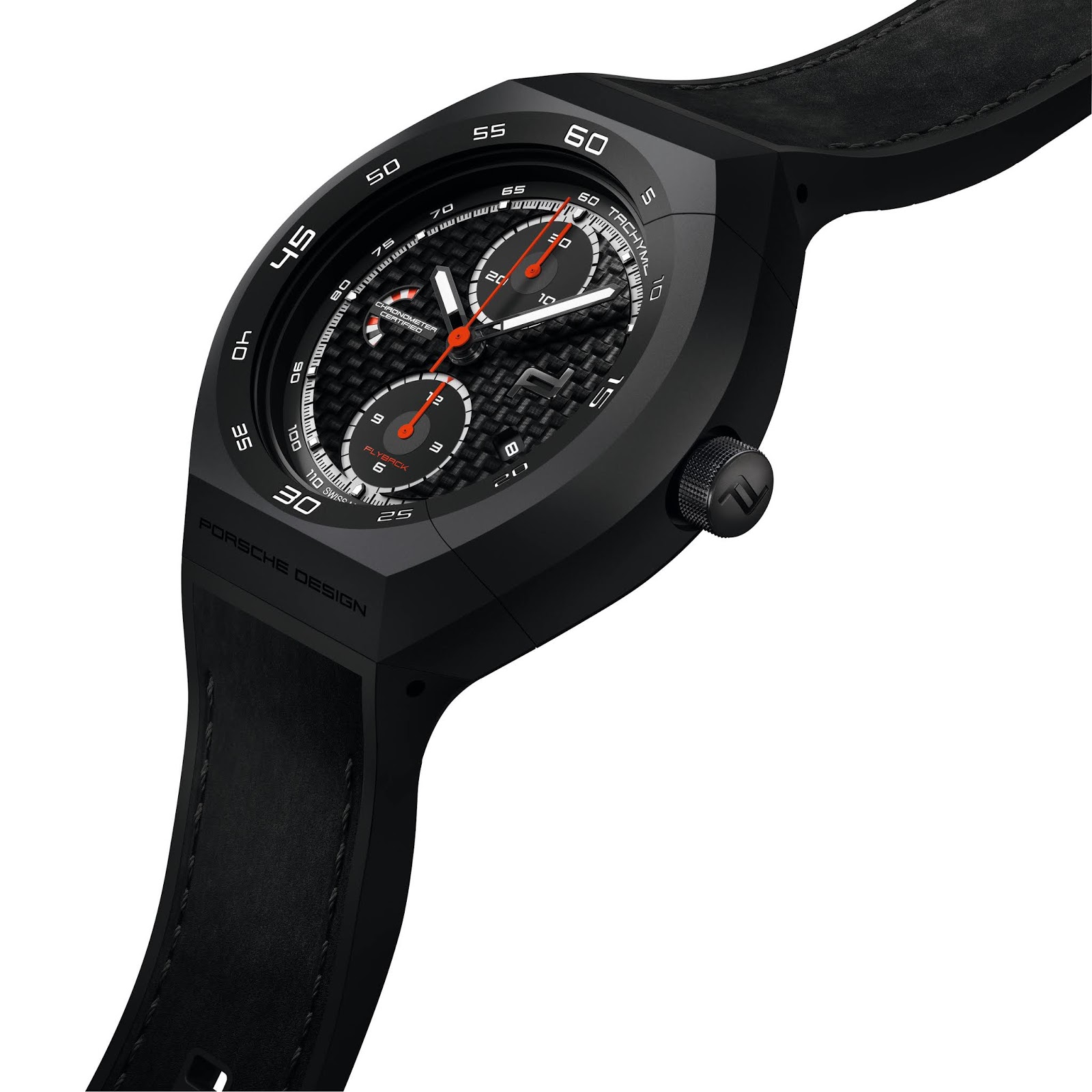 技術的にも視覚的にも、このクロノグラフはモータースポーツの世界への深いつながりを反映しています。GTチームのレーシングカーのコンポーネントに触発されたマットブラックのカーボンダイアルは、ブラック、レッド、グレー、ホワイトのカラー構成を連想させます。さらに「9時」位置のファンクション・インディケーターは、特徴的な赤と白の縁石のデザインを反映しています。クロノグラフ機能の技術は、Porsche 911 RSRの高性能エンジンのコンセプトに由来しています。