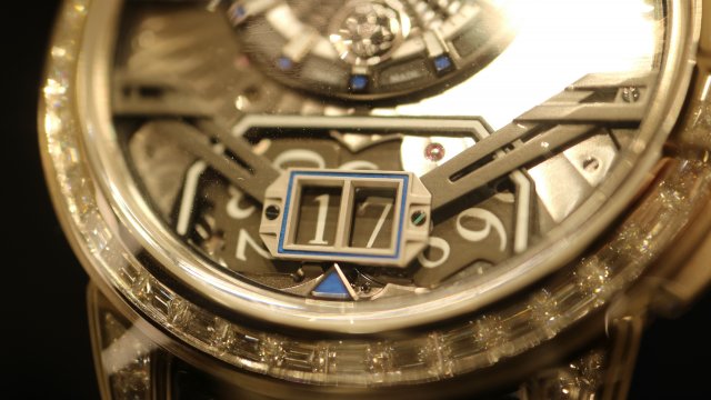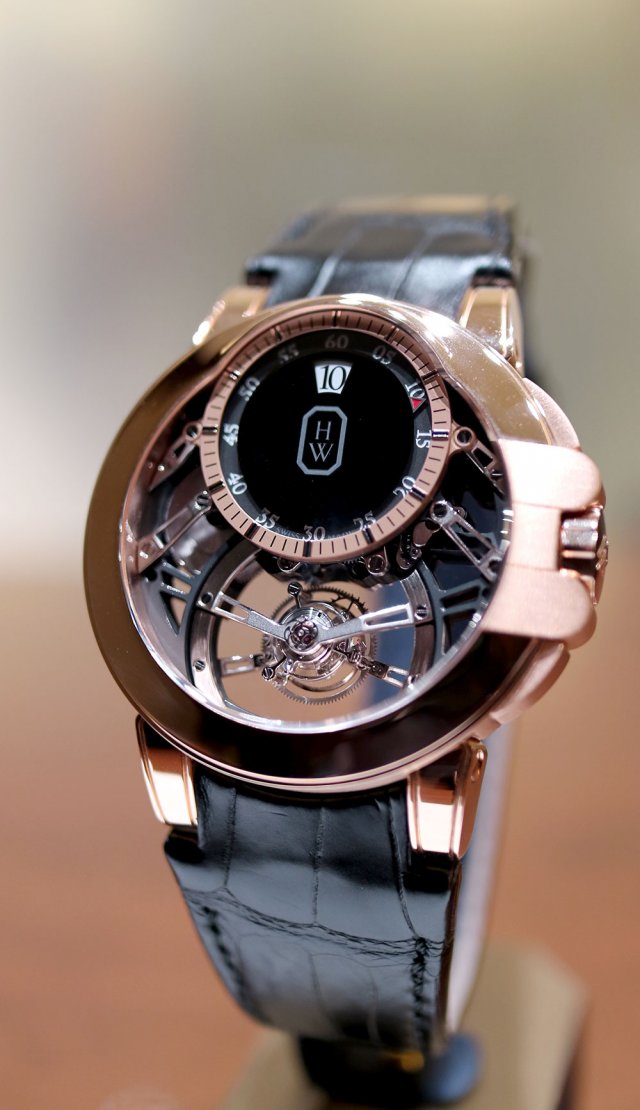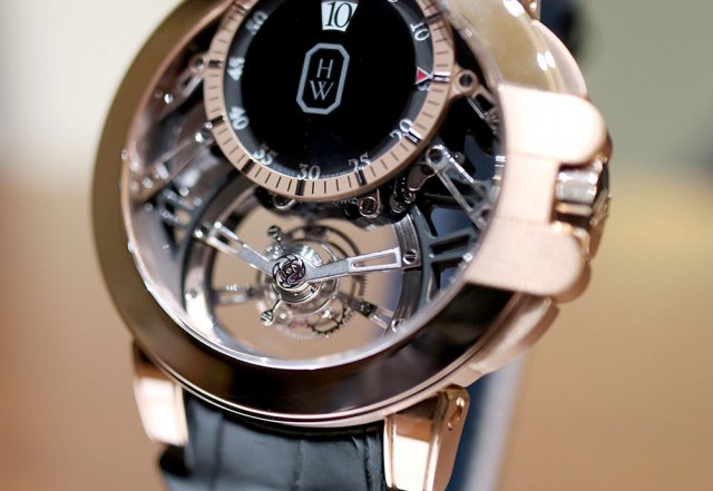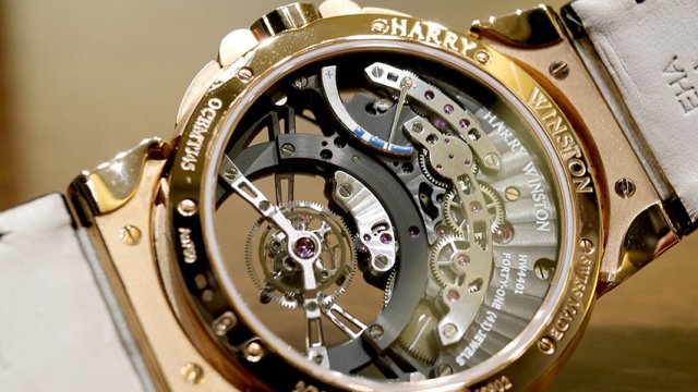 ハリー・ウィンストンの「オーシャン・トゥールビヨン ジャンピングアワー」は、12時側のオフセンターに位置するジャンピングアワー機構と、6時位置のトゥールビヨンが見事なバランスでデザインされたモデルです。