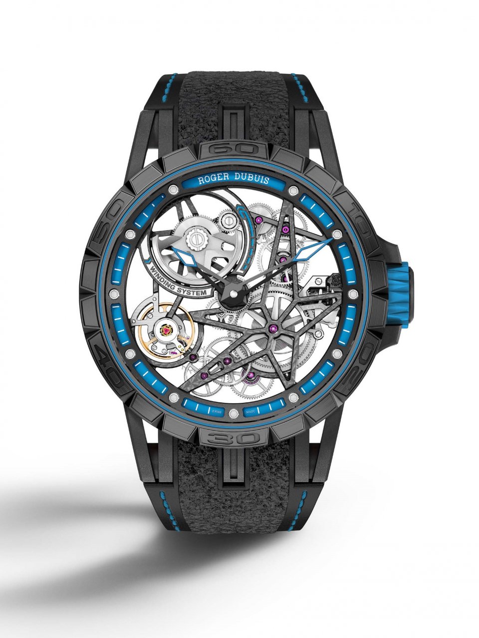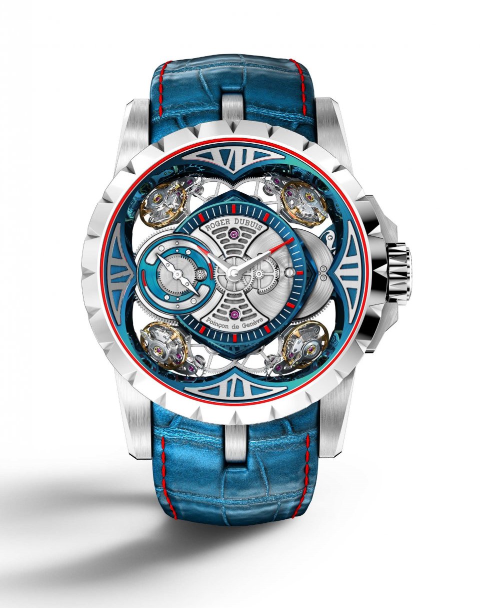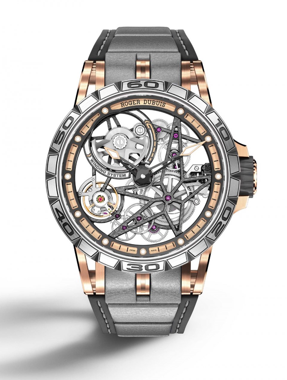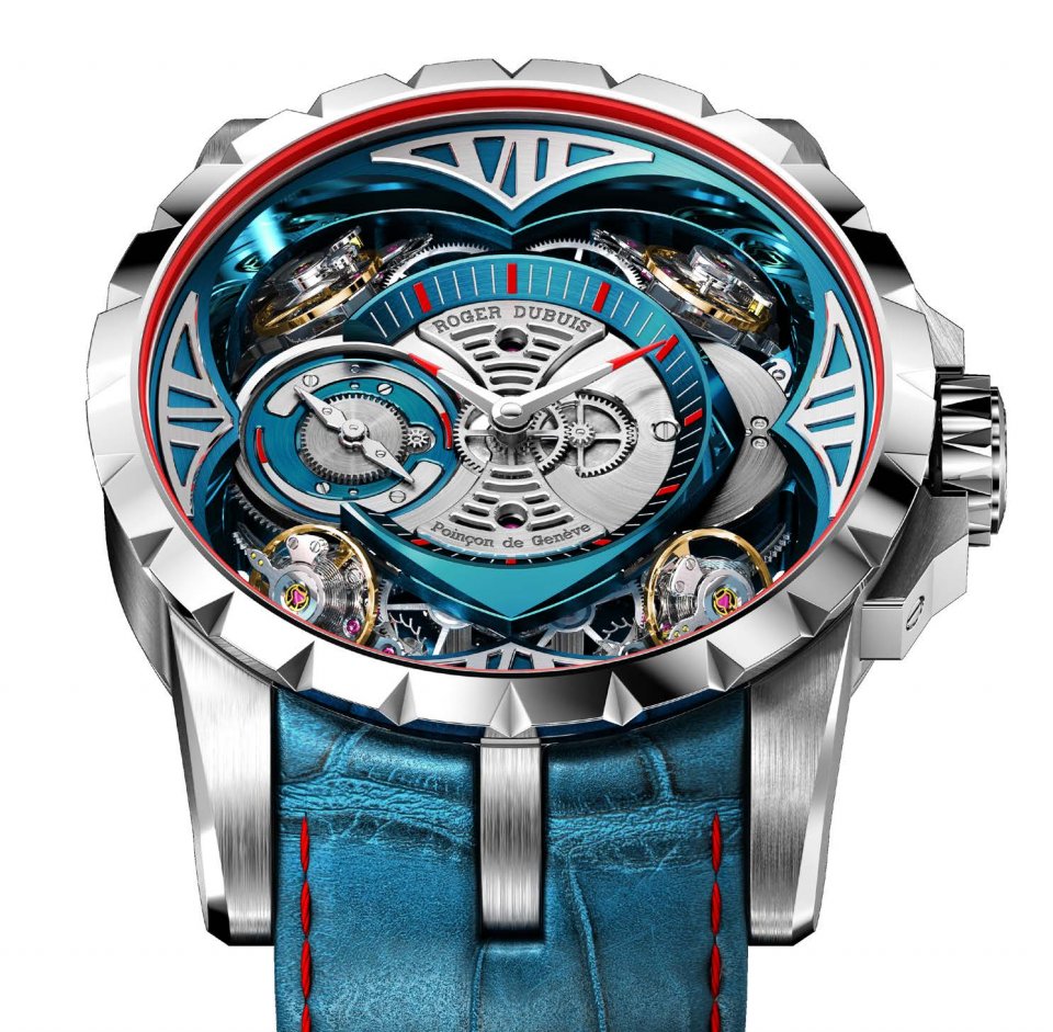 ロジェ・デュブイのユニークなスケルトン技術を、ムーブメントだけでなくベゼルやフランジなど外装部品にも展開するエクスカリバースパイダーのコンセプトにより、この意味深いカラーがオープンワークの針のルミネサントチップの外周にもコーディネイトされ、一段とスタイルを引き立てています。