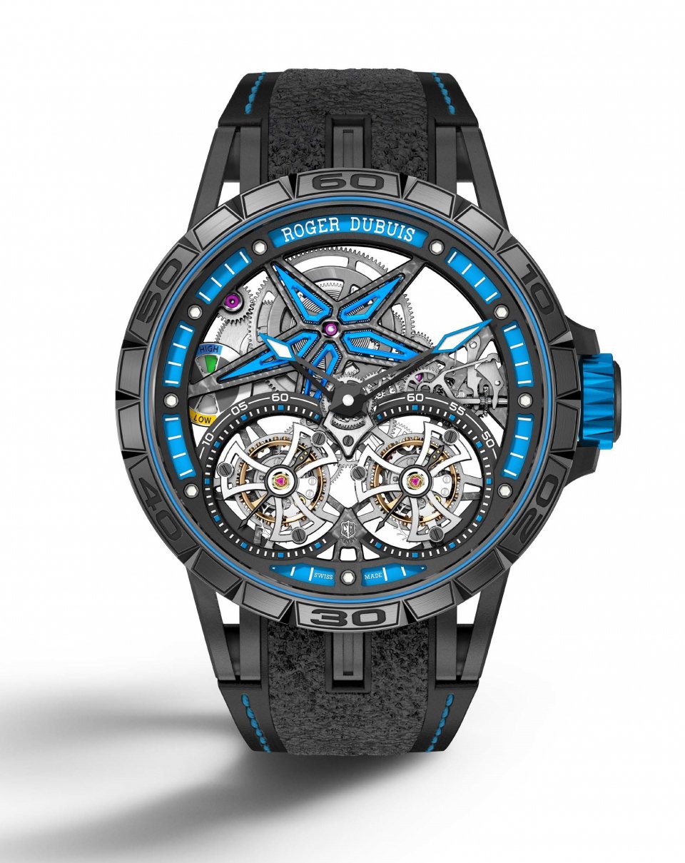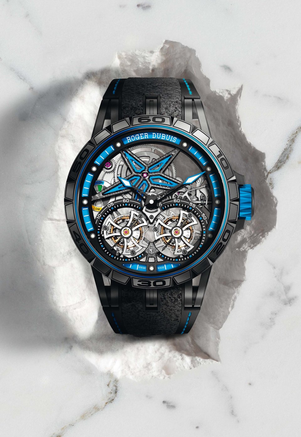 エクスカリバー スパイダー ピレリ – ダブルフライングトゥールビヨン耐久性と信頼性を最大限に追求したこのモデルは、最速レーンで走る人生にぴったりです。頑丈な47ミリのブラックDLCチタンのスケルトンケースにブルー硫化ラバーでアクセントをつけ、チタン製クラウンと“コンテナ”をアピールしました。メカニズムのファンの皆様には、上記のユニークな“ピレリ”デザインをアピールし、ブルーのアストラルスケルトンのシグネチャーを備えた新しい手巻きキャリバーRD105SQをお楽しみいただくことができます。5時位置と7時位置のフライングトゥールビヨン、速度計にインスパイアされたポインターがついた秒カウンター、またマルチカラーのパワリザーブ表示はレーシングカーのコックピットの燃料ゲージにインスパイアされています。ロジェ・デュブイ ブティック限定の限定エディションのうち8個には、“お金で買えない”アドレナリン全開の体験、モータースポ―ツイベントでピレリが開催する2日間のVIPプログラムが加えられています。