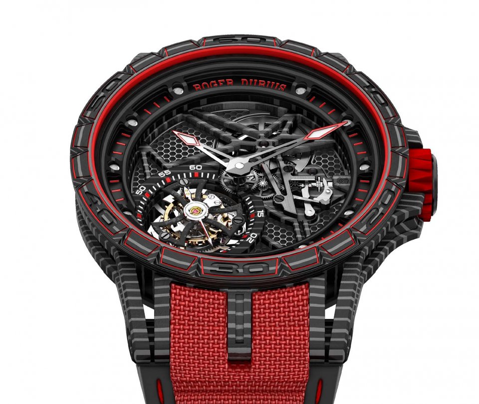 このような驚異的な成果は、スケルトンキャリバーという複雑な構造の中でT700 カーボンという耐久性に優れた素材を使用することにより、振動が少なく高い精度を保つというメリットとなって表れています。高度な飽和プロセスにより生成される非常に薄いレイヤー構造は、多くの優れた特性を持っています。通常のカーボンより8%空隙率が低い均一な構造と30%軽量というメリットから、トゥールビヨンのアッパ—キャリッジの回転がスムーズになります。10度に傾斜したレイヤーをキャリバー地板とブリッジに加工するには高度な技術を要します。同時にその高い技術性が高いデザイン価値を生み出しています。目的はケースミドルに見えるのと同じモチーフをムーブメントにも施すことです。手首にこれをしっかりとフィットさせるのは、ラバーベースに赤のラバーテックのファブリック風のインレイをあしらい、DLCチタンのフォールディングバックルのついたストラップ。エクスカリバー スパイダー カーボンは28 個の限定エディションです。