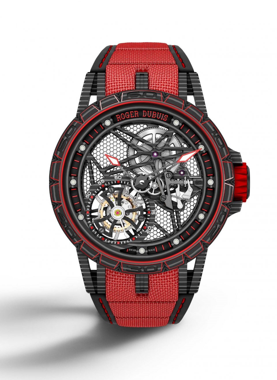 エクスカリバー スパイダー カーボンロジェ・デュブイはSIHH 2017でもう一つのワールドプレミア、エクスカリバー スパイダー カーボンという“野獣を放ち”ます。この印象的な赤と黒のモデルでは、スパイダータイプのスケルトンケース、DLC加工のリューズとケースバック、“コンテナ”の全てがチタン製です。ケースには軽量で耐久性の高い素材と多層カーボンを組み合わせ、“コンテナ”は硫化ラバー 、ベゼルは赤いラッカーでライトアップしています。さらに重要なのは、地板、ブリッジ、トゥールビヨンアッパーキャリッジの全てがカーボン製であるという初のムーブメントを搭載していることです。この素材を使ったことで“シャシー”を構成するメインプレートとケースがより軽量になりました。車のラジエーターグリルにインスパイアされた蜂の巣模様のダイヤルは、キャリバーRD509SQにふさわしいハイテクの世界を感じさせます。このキャリバー“アストラルスケルトン”フライングトゥールビヨンは振動数21,600/時でパワーリザーブは70時間。28個限定
